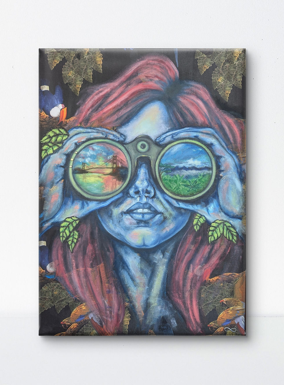 Within the lenses, places, memories, or imagined visual worlds appear.